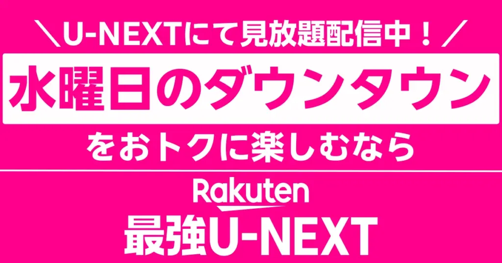 「水曜日のダウンタウン」の見逃し・過去回をお得に見る方法を楽天社員が解説。U-NEXT(月額2,189円相当)がデータ無制限の通信費とセットで月額3,278円になる「Rakuten最強U-NEXT」プランを紹介します。TVerを逃した方必見です。 -
