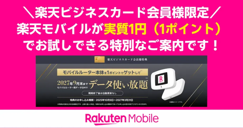 楽天ビジネスカード会員限定で楽天モバイルを実質1円(1ポイント)で試せる特別案内。無制限+テザリングの活用法、申込~本人限定受取郵便、開始までの流れを解説。 -