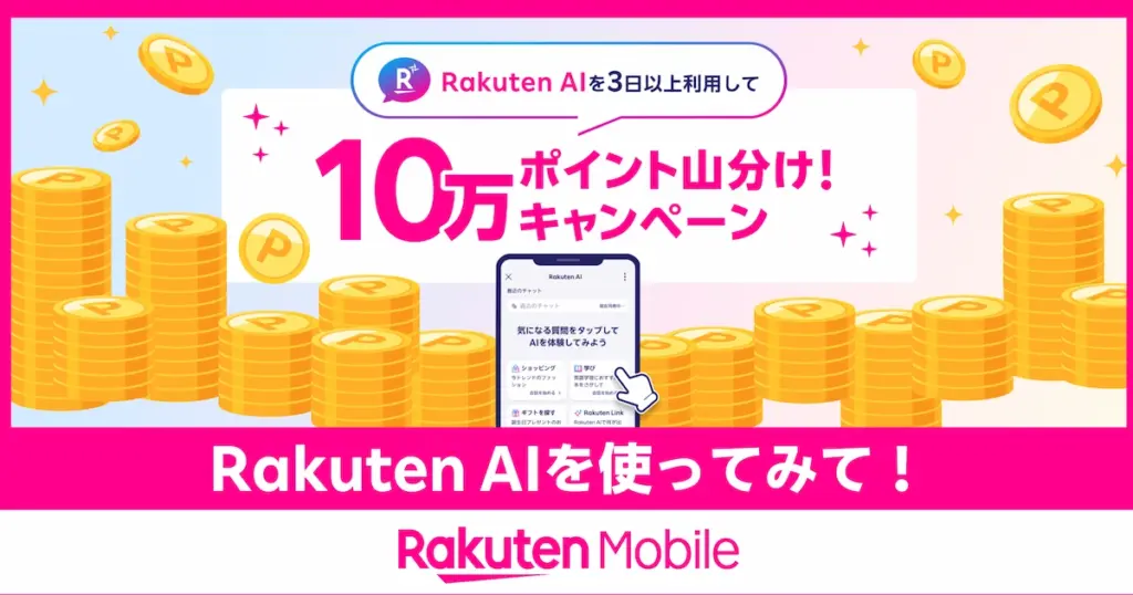 楽天モバイル契約者限定。Rakuten AIを期間中に3日以上利用で10万ポイント山分けの対象に。エントリー方法、利用カウントの考え方、進呈時期(2026/1/31頃)までを簡潔に解説。 -