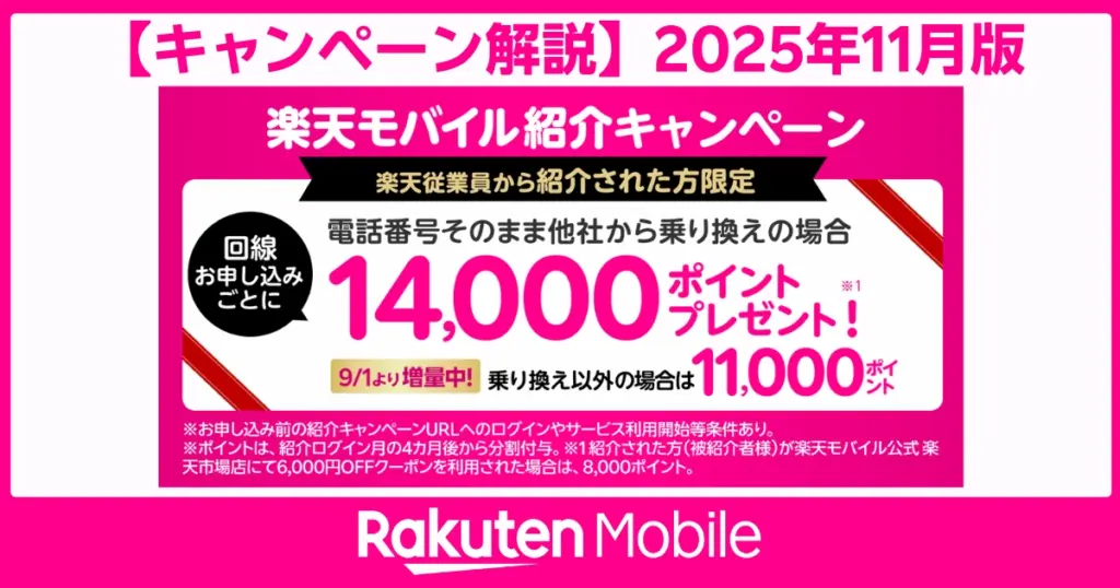 楽天従業員紹介で楽天モバイルを最もおトクに契約。MNP14,000pt/新規11,000pt/Turbo7,000ptの進呈条件と手順を2025年11月版で解説。 -