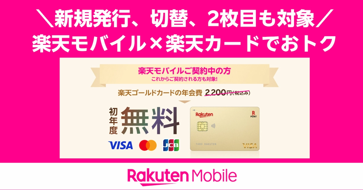 - キャンペーン内容: 楽天モバイルをご契約中、またはこれからご契約される方は、楽天ゴールドカードの初年度年会費(2,200円)が無料になります。