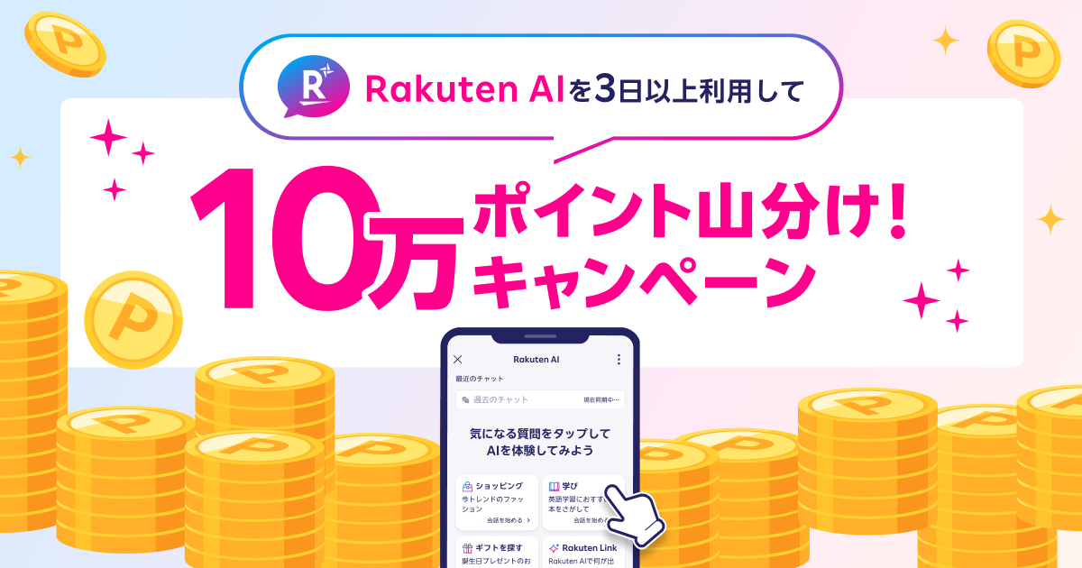• キャンペーン内容: キャンペーン期間中に「Rakuten AI」を3日以上利用すると、楽天ポイント10万ポイントを対象者全員で山分けしてプレゼントします。