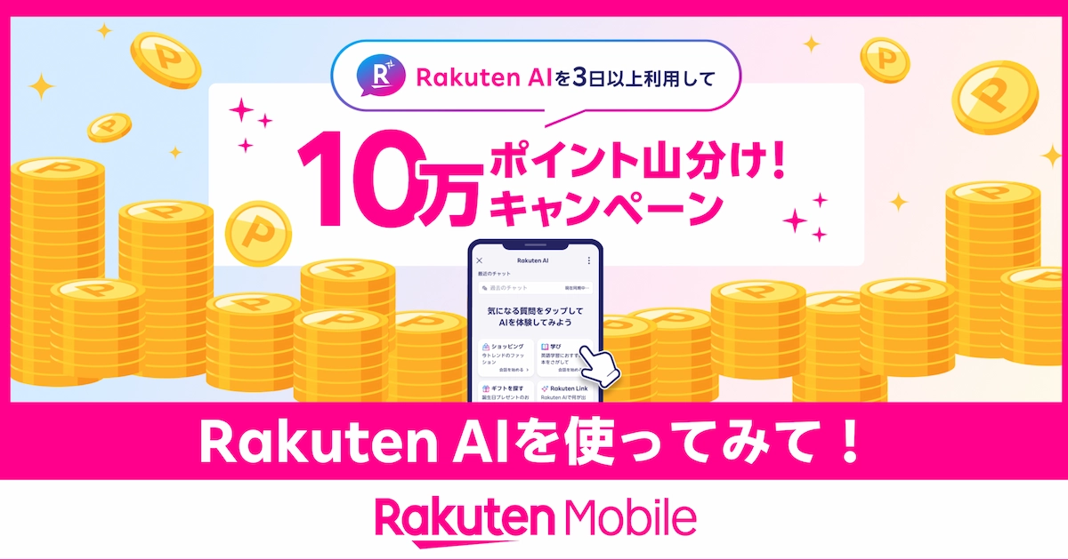 • キャンペーン内容: キャンペーン期間中に「Rakuten AI」を3日以上利用すると、楽天ポイント10万ポイントを対象者全員で山分けしてプレゼントします。