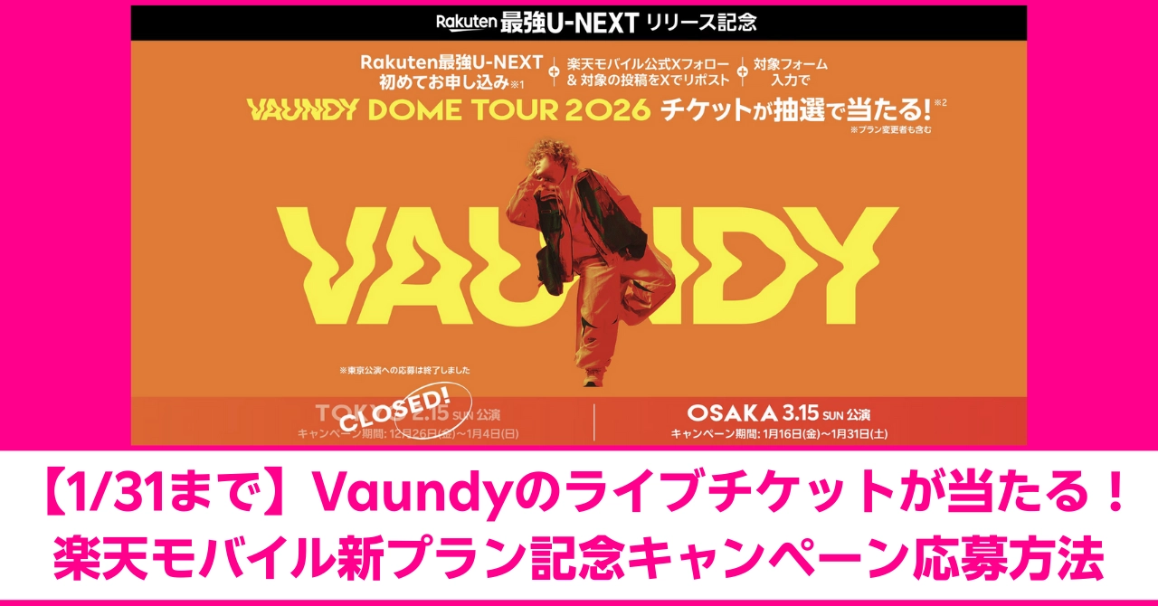 楽天モバイルの新プラン「Rakuten最強U-NEXT」のリリースを記念して、なんと「Vaundy DOME TOUR 2026」のチケットが抽選で当たるキャンペーンが開催中です。